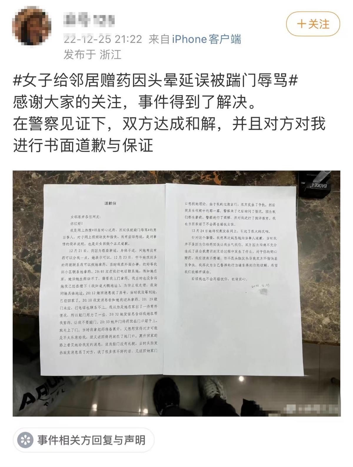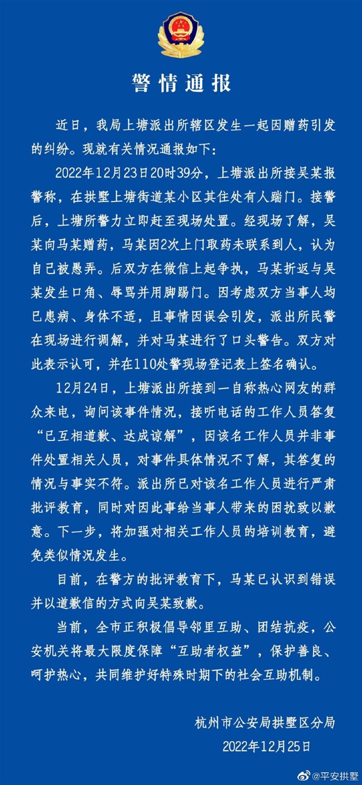 近日,网传浙江杭州一女子赠送感冒药给邻居男子,因生病头晕延误了几分钟,反被该男子上门踹门辱骂,引发网络热议。杭州市公安局拱墅区分局刚刚发布通报称,在警方的批评教育下,踹门者马某已认识到错误,并以道歉信的方式向赠药者致歉。(据12月25日北京青年报)
