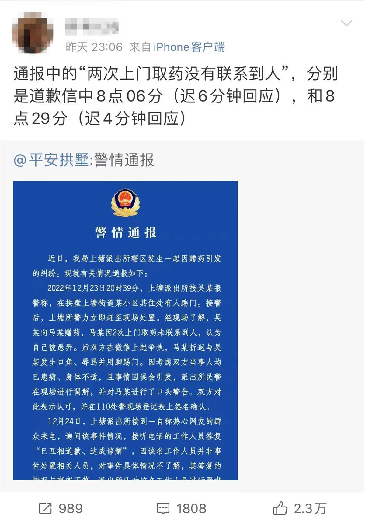 据警方通报,此前有工作人员因对事件具体情况不了解,回复网友称,此事的处理结果是双方“已互相道歉、达成谅解”,再次让舆论沸腾。很多网友气愤地质问:赠药的女子到底做错了什么?她只是好心帮助他人,为什么还要向没素质的骚扰者道歉?这是告诉大家不要管闲事做好人吗?