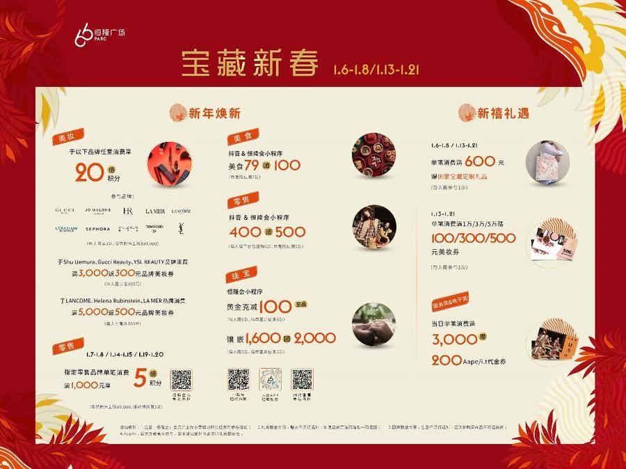 据悉,1月6日至8日及1月13日至21日,恒隆广场将推出宝藏新春活动,为消费者带来新年焕新和新禧礼遇。世茂广场将在春节期间推出庙会、非遗市集、春联互动等活动,以及特定品牌团券、会员的多倍积分、礼品兑礼等优惠。万象城将在小年期间推出零售券85团100/780团1000券、近百家餐饮类品牌享78团100等促销活动;春节假期还有禧狮献瑞闹新春、国风曲艺演出、猜拳赢财神得糖葫芦等惊喜活动。和谐广场将在春节期间推出半价餐饮、零售50团100、黄金克减80元起等折扣。华山环宇城将陆续推出正餐69团100、小餐9.9团20、零售70团100、黄金珠宝900团1000等超值团购活动,大年初一至初七,精彩的高跷巡游及舞龙舞狮等民俗演艺即将上演。大润发将在春节期间迎来一年一度的“年货大街”,让消费者尽情选购年节礼盒、酒水等商品。