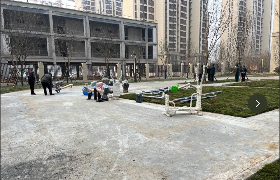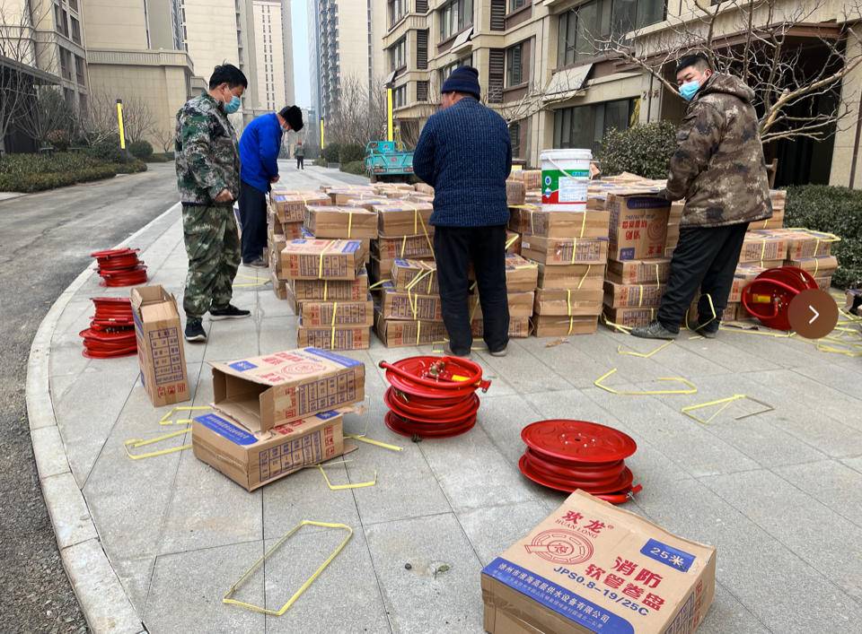 进入小区后,一处楼前堆放了上百个未全部拆封的消防软管卷盘,工人正在准备进楼安装。此外,记者随机进入的8号楼1单元、13号楼,楼内的消防栓未安装消防软管卷盘。小区南侧的一处小广场刚准备安装健身器材,路面也还是坑洼的混凝土,未铺设表层。现场有二三十名工人正在调整草坪,清理户外公共区域的建筑垃圾,现场还有压路机等在作业。