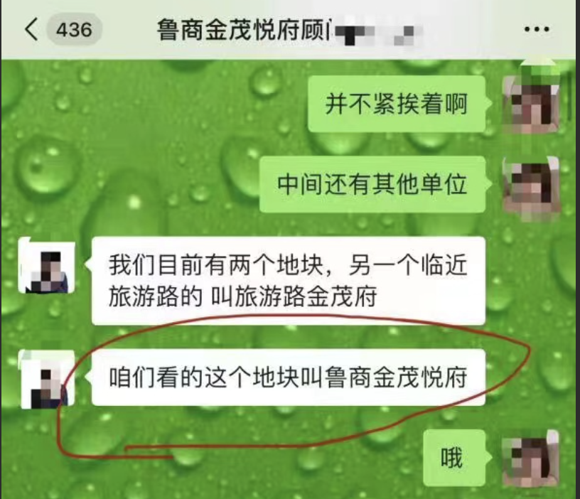 记者查询发现,鲁商悦府的名字也是一时一个变。一个认证为济南丰茂置业有限公司名为“金茂济南”的公众号上,2020年6月10日的一篇推文中,将该项目称为鲁商金茂国际社区,文末又以小字标注称“本项目推广名为【鲁商金茂旅游路鲁商悦府】,标准名称为【鲁商悦府小区】”。不过业主路先生提供的与置业顾问的聊天截图显示,2020年6月9日前,置业顾问称项目就叫鲁商金茂悦府。
