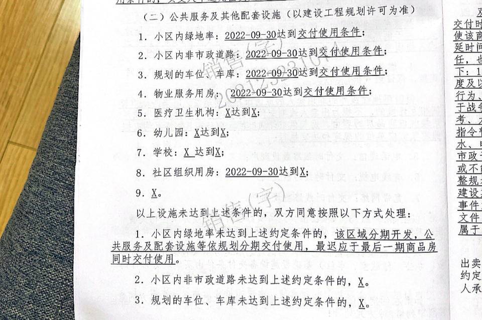 记者查阅购房合同,第十条明确了商品房相关设施设备交付条件,其中条款(一)详细明确了水电气暖等配套设备的交付条件。同时,条款(二)明确了公共服务及其他配套设施的交付条件,其中小区内非市政道路2022年9月30日达到交付使用条件。