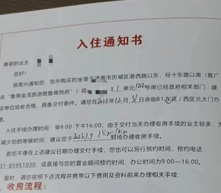 壹粉超哥2021年6月28日购买了鲁商悦府小区东区的一套住宅,购房合同约定2022年9月30日交房,但开发商建设已延期。2022年年底,他突然收到了开发商发来的《入住通知书》,称房子“已经政府相关部门、建设单位验收合格,具备交付条件,请在2022年12月31日亲临B1东区北大门办理”。