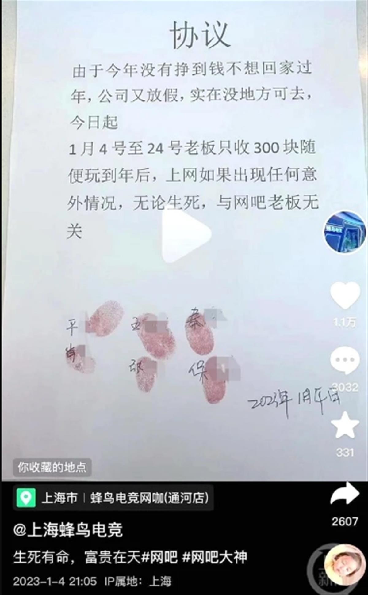 1月4日晚,“上海蜂鸟电竞”发布一条视频,上面晒出了6名网友签字并按下手印的协议,并附文“生死有命,富贵在天”。协议上写着:“由于今年没有挣到钱不想回家过年,公司又放假,实在没地方去,1月4日至24日老板只收300块随便玩到年后,上网如果出现任何意外情况,无论生死,与网吧老板无关。”(据1月5日上游新闻报道)