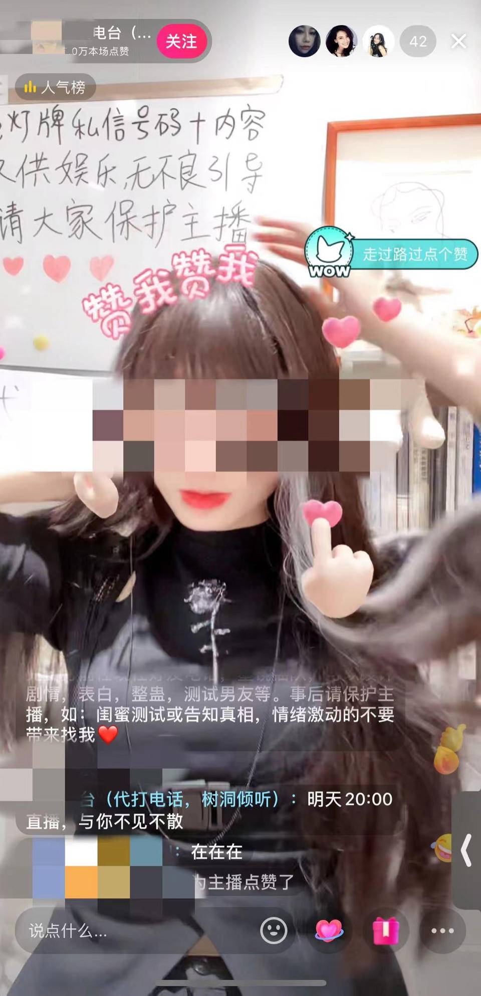 在另一个名为“**电台(代打电话,树洞倾听)”的直播间,主播写着,“亮灯牌私信号码+内容,仅供娱乐,无不良引导。”记者发现,该主播还在其视频中介绍提供剧情设计。