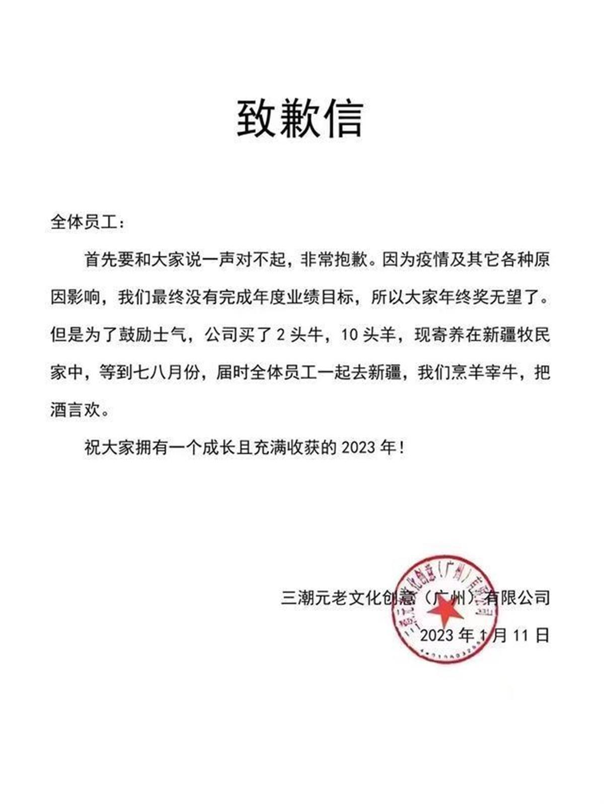 1月11日,广东广州。网曝三潮元老文化创意(广州)有限公司取消年终奖、欲邀请员工夏天去新疆聚餐的道歉信,引发关注。信中提到,公司因没有完成年度业绩目标,决定不发年终奖。但为了鼓舞士气,公司买了2头牛、10头羊,现寄养在新疆牧民家中,等到七八月份,邀请全体员工一起去新疆烹羊宰牛,把酒言欢。(据1月12日中新经纬)