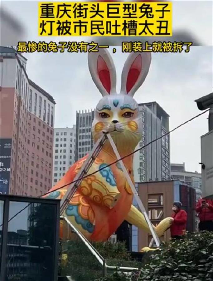 兔年春节将至,多地在公共场所的节日装饰中,都选择了小兔子相关的元素,但重庆沙坪坝三峡广场出现了巨型灯饰兔子,却遭到很多市民吐槽。有网友直呼“丑哭、吓人”,也有网友表示,这种风格借鉴了中国传统文化剪纸,挺好看的。目前,这一巨型灯饰已经开始拆除。(据1月18日大象新闻)