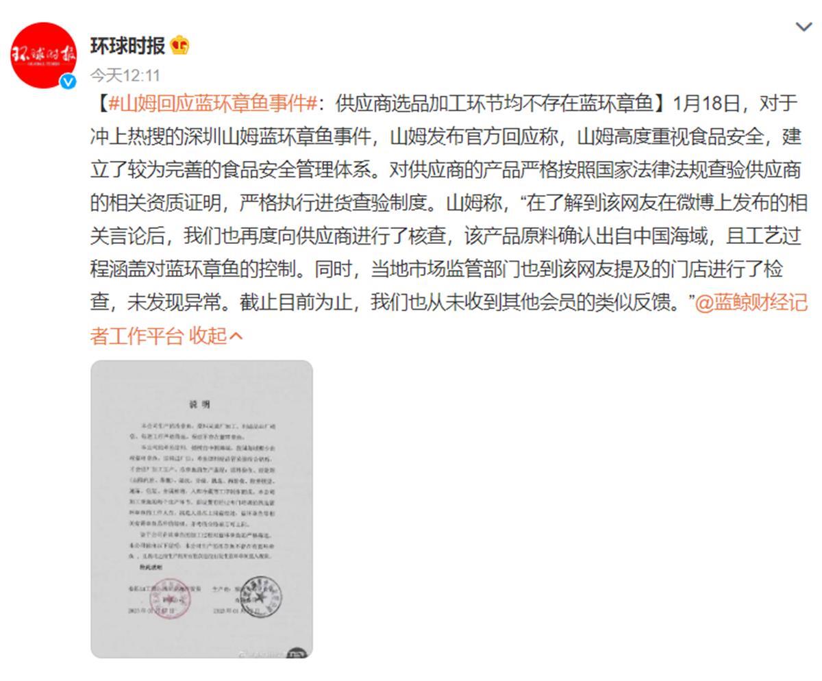 1月18日,对于冲上热搜的深圳山姆蓝环章鱼事件,山姆发布官方回应称,“在了解到该网友在微博上发布的相关言论后,我们也再度向供应商进行了核查,该产品原料确认出自中国海域,且工艺过程涵盖对蓝环章鱼的控制。同时,当地市场监管部门也到该网友提及的门店进行了检查,未发现异常。截至目前为止,我们也从未收到其他会员的类似反馈。”(据1月18日界面新闻)