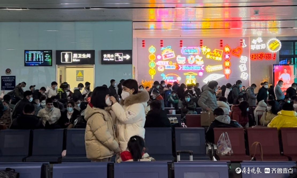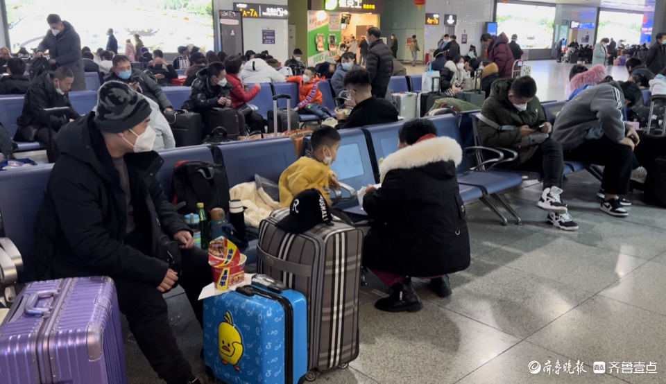 16日晚上8点多,夜幕下的济南站很热闹。四面来的旅客,急匆匆拉着大包小包涌进站里。在候车大厅,等车的人把一排排座位占得满满当当,就连过道,也被箱子占据。一对小情侣正依偎在一起,共用一只耳机,听着同一首歌;一位母亲把远处的女儿叫到身边,双手把她的口罩整理严实;两位并排坐着的小朋友正在享用奶酪棒,边吃边摆动着小腿;开车把朋友送到济南的宋先生正等着前往河南的列车,热爱健身的他把候车厅当成健身房,找了个无人的地方跳起操来......