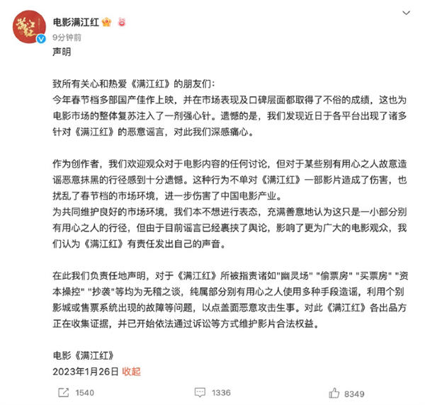 据观察者网报道,1月24日晚间,有微博网友反映,自己购买的《流浪地球2》电影票被影院以“设备故障”为理由退款后,发现影院又将当天同一时段的同一放映厅让给了同期上映的《满江红》,引发争议。对此,涉事电影院工作人员表示,退票当天确实有一台机器出现故障,而根据影片上座率等更改排片也是影院常见做法。1月26日,电影《满江红》官方发布声明称,诸如“幽灵场”“偷票房”等均为无稽之谈,纯属部分别有用心之人使用多种手段造谣。