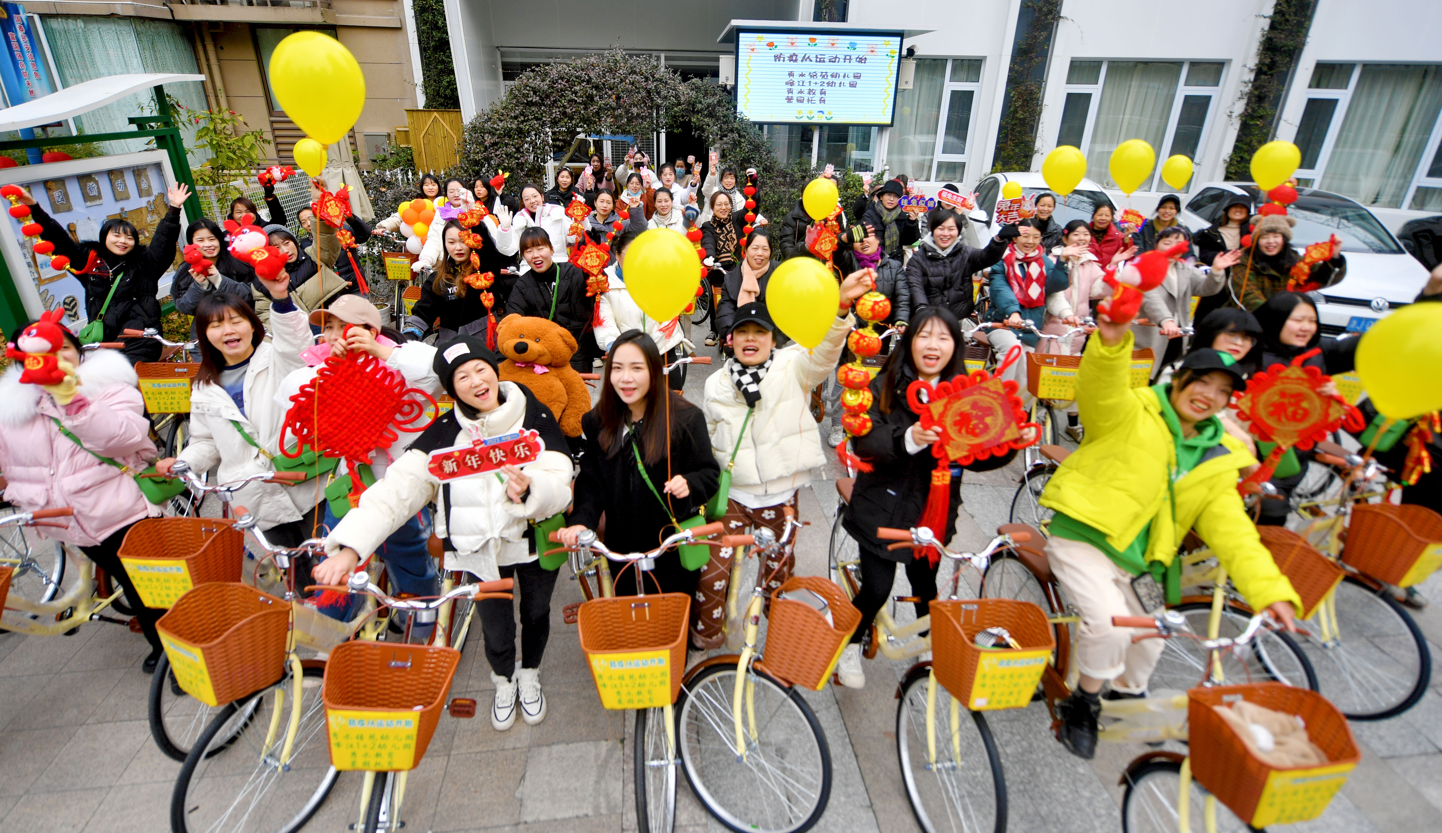▲2023年1月17日,浙江台州市路桥区路南街道秀水铭苑幼儿园的老师们沿着大街小巷快乐骑行,喜迎新年到来。图/新华社