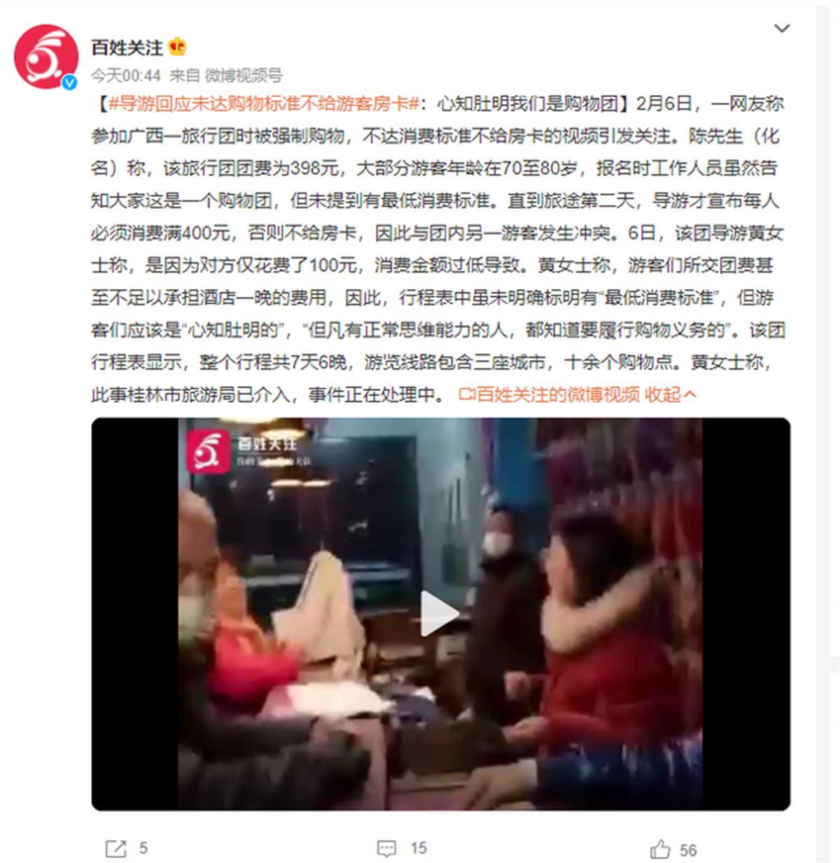 2月6日,一网友称参加广西一旅行团时被强制购物,不达消费标准不给房卡的视频引发关注。陈先生(化名)称,该旅行团团费为398元,大部分游客年龄在70至80岁,报名时工作人员虽告知大家这是一个购物团,但未提到有最低消费标准。直到旅途第二天,导游才宣布每人必须消费满400元,否则不给房卡,因此与团内另一游客发生冲突。(据2月7日百姓关注)