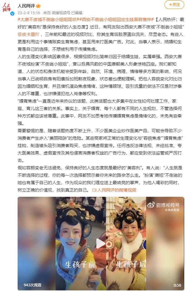 近日,有网友贴出西安大唐不夜城“不倒翁小姐姐”@皮卡晨吖 ,三年前和最近的视频对比,称其生育后胶原蛋白流失,尽显老态。有些人更是利用这个事情贩卖生育焦虑,甚至用来打医美广告。对此,当事人表示,结婚和生育是自己的选择,不想被利用于传播焦虑。