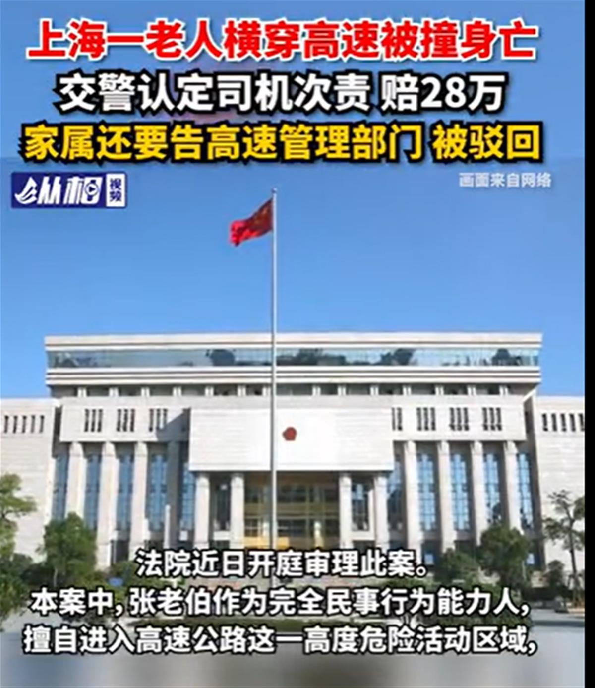 高速公路上突然出现一名横穿公路的九旬老人,尽管司机猛踩刹车,但仍撞上老人,并致老人死亡。交警认定司机承担次要责任,并经调解由保险公司赔偿老人家属28万余元后,老人的家属又把高速公路管理部门诉至上海松江法院。法院近日驳回了老人家属的诉讼请求,一审判决后,双方均未提起上诉,现已生效。(据2月11日光明网)