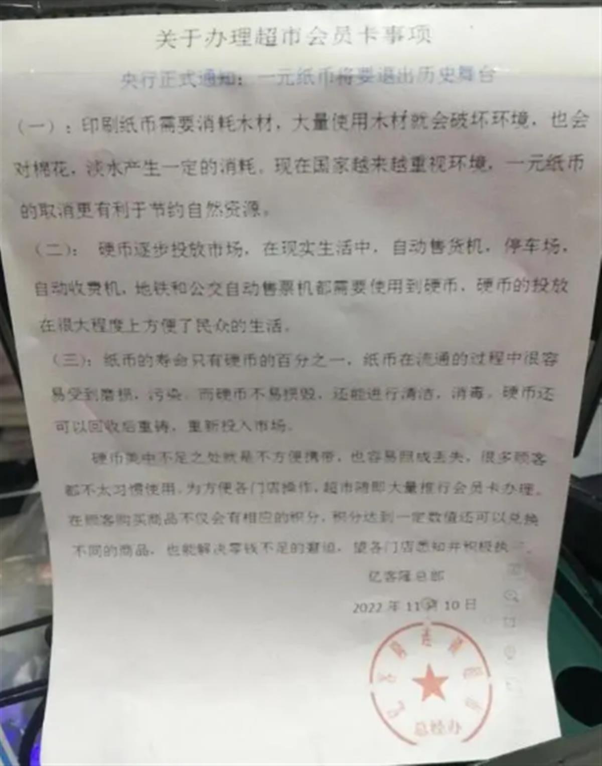 有网友认为,这就是超市瞎编,目的就是为了推广会员卡。这样,既能捆绑客户,还能少些找零收零、到银行存取的麻烦。但超市哪有私自宣称“一元纸币将退出历史舞台”的权力?