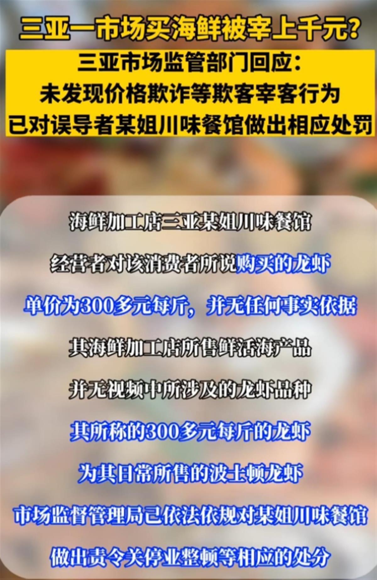 美食博主在海南三亚某海鲜店以700元每斤的价格购买俗称“大蜜蜂”的龙虾,一海鲜加工店老板随后提醒“买贵了”,并称每斤只要300多元,该博主购买的3888元海鲜实际只需2100元。