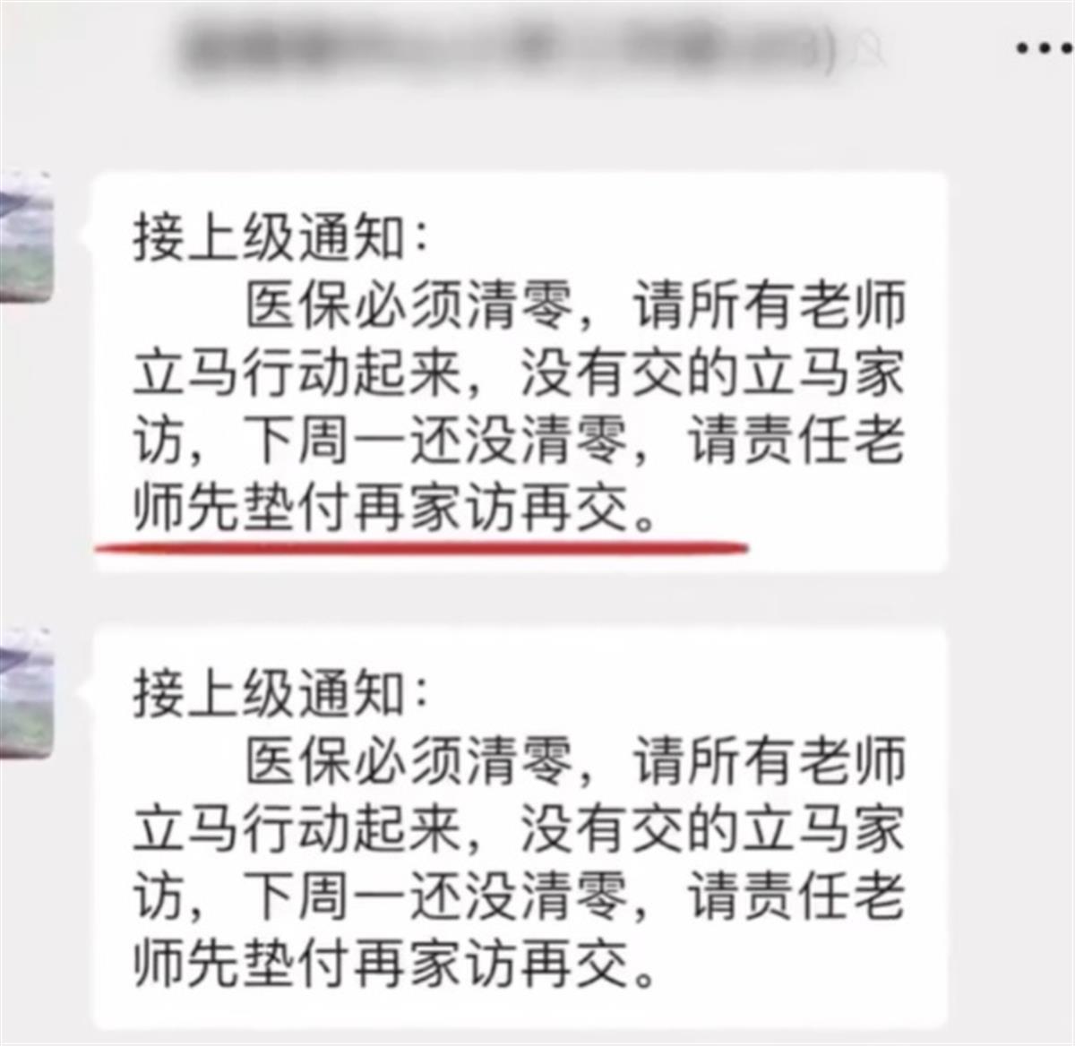 而另一张截图显示,医保必须清零,没有交的要老师立马家访,下周还没清零,责任老师先垫付再家访再交。也就是说,为了达到数据上的完美,如果家长没给学生交医保,老师就要掏钱出来先交了再说。老师一个人可能要对多个学生,如果有好几个学生没交医保,老师如何承担得起?家长不想交医保,老师就得掏钱跑腿,如此紧密的利益捆绑,又如何营造健康的家校关系?