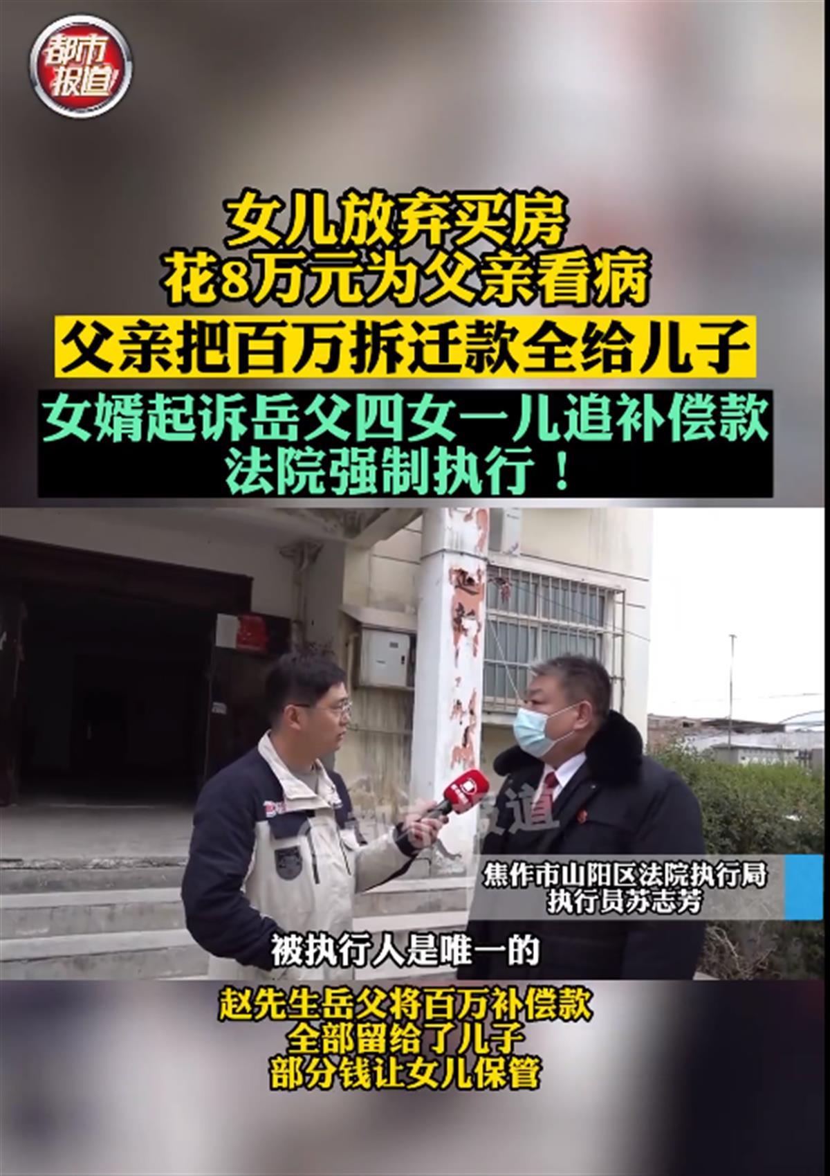 近日,河南焦作。2017年赵先生的岳父重病,想要卖房筹钱,但找不到买家。看到父亲重病,二女儿一家放弃买房,把8万元给了父亲,作为补偿,父亲索性把后院宅基地卖给了二女婿赵先生。2019年宅基地突然拆迁,获得了100多万元补偿款,而岳父直接把这100多万元补偿款都给了唯一的儿子,部分钱让女儿们保管。赵先生认为,自己已经买下了宅基地,拆迁补偿款也应该属于自己,便把岳父的四个女儿和一个儿子起诉到法院。基于买卖事实,焦作市山阳区法院支持了赵先生的诉求,判决岳父子女把百万补偿款返还给赵先生。近日,法院对此强制执行。(据3月16日河南电视台《都市报道栏目》)