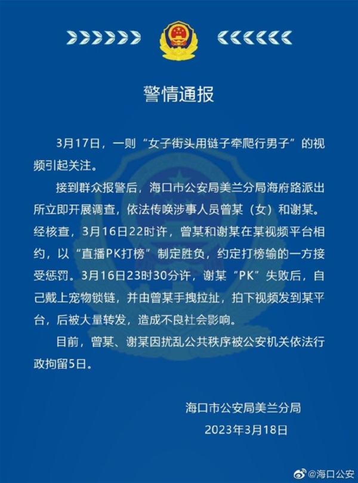 3月18日,海口市公安局美兰分局发布警情通报。3月17日,一则“女子街头用链子牵爬行男子”的视频引起关注。接到群众报警后,海口市公安局美兰分局海府路派出所立即开展调查,依法传唤涉事人员曾某(女)和谢某。经核查,3月16日22时许,曾某和谢某在某视频平台相约,以“直播PK打榜”制定胜负,约定打榜输的一方接受惩罚。3月16日23时30分许,谢某“PK”失败后,自己戴上宠物锁链,并由曾某手拽拉扯,拍下视频发到某平台,后被大量转发,造成不良社会影响。(据3月18日光明网)
