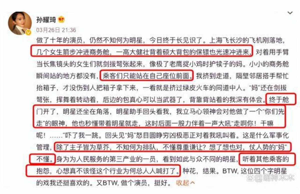 近日,演员孙耀琦吐槽自己坐飞机时遇到了明星耍大牌,粉丝冲进商务舱各种拍,明星无动于衷导致舱内拥堵。她没有说出这位明星的名字,但表示是“四字明星”。(据3月27日东北网)