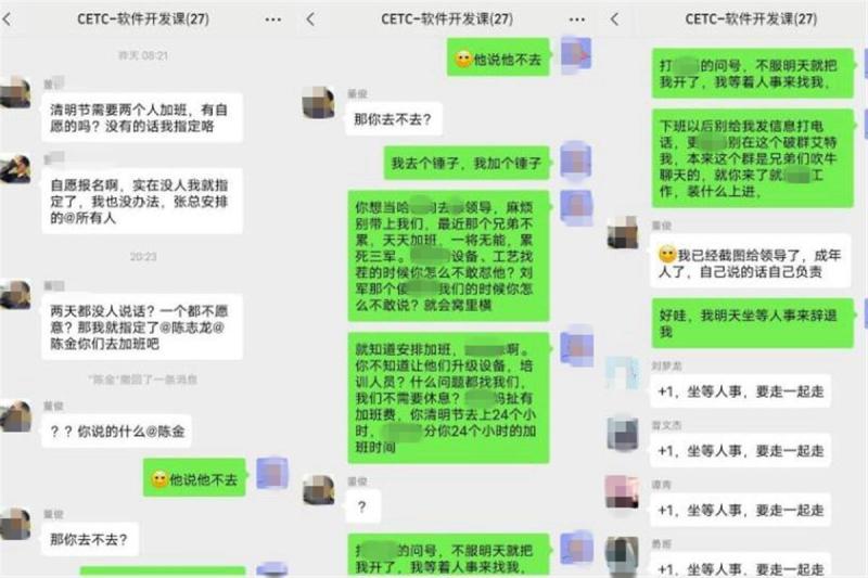 4月4日,疑似“中国电科员工因清明节被强制加班怒怼领导”的聊天记录在网络上热传。