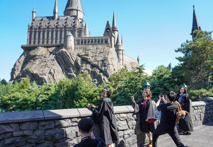 游客在北京环球影城哈利·波特的魔法世界主题景区拍照。新华社记者陈钟昊摄