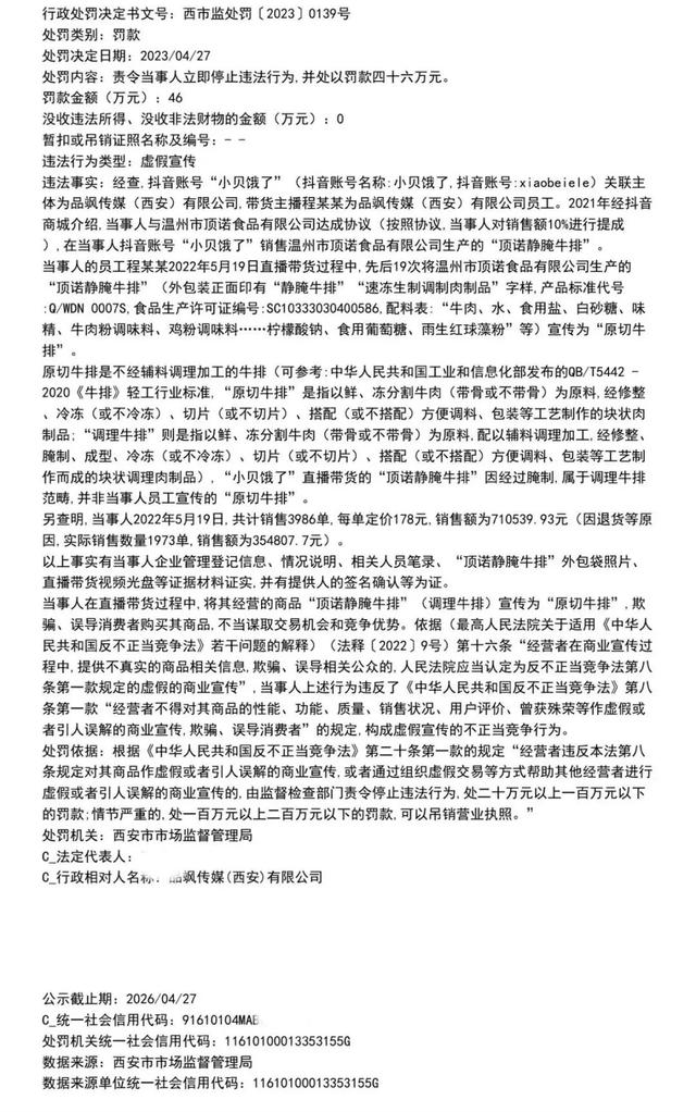 此前,陕西西安一名拥有千万粉丝的吃播主播“小贝饿了”,在直播带货中将“静腌牛排”19次说成“原切牛排”,引发关注。近日,该账号关联公司品飒传媒(西安)有限公司因此事涉及的虚假宣传,被当地市场监管部门依法处以罚款46万元。