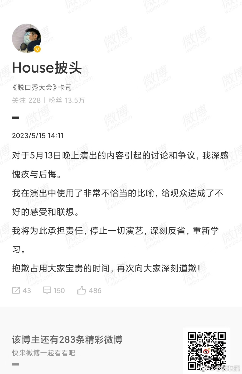 刚刚,脱口秀演员@House披头发文称:对于5月13日晚上演出的内容引起的讨论和争议,我深感愧疚与后悔。我在演出中使用了非常不恰当的比喻,给观众造成了不好的感受和联想。我将为此承担责任,停止一切演艺,深刻反省,重新学习。抱歉占用大家宝贵的时间,再次向大家深刻道歉!