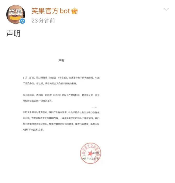 随后上海笑果文化传媒有限公司发布官方声明,全文如下: