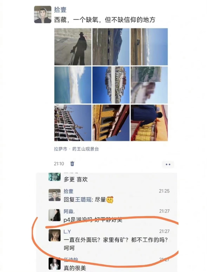 近日,一则#辞职后去旅游发朋友圈被说了#的话题登上热搜。新闻中,网友鲁先生自今年3月辞职后,已经在国内玩了20几个城市,并常在朋友圈分享旅途照片与感想。一位微信好友在其发布的动态下评论:“一直在外面玩?家里有矿?都不工作的吗?呵呵。”对于辞职去旅游,鲁先生表示,“我以前那个行业不会去做了,确实压力太大,一直要加班,我喜欢更自由的工作,以后哪怕实在找不到工作、哪怕去摆摊,我都不想回去上这个班了。”