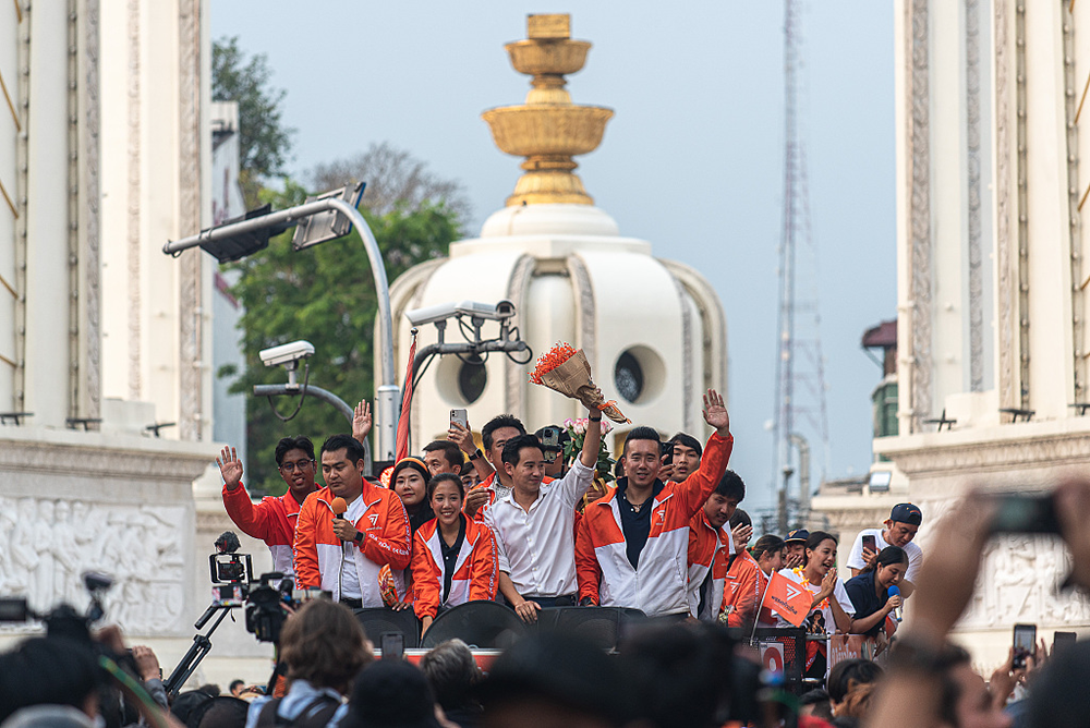 当地时间2023年5月15日,泰国曼谷,泰国远进党党魁皮塔在庆祝游行中向支持者致意。本文图片人民视觉