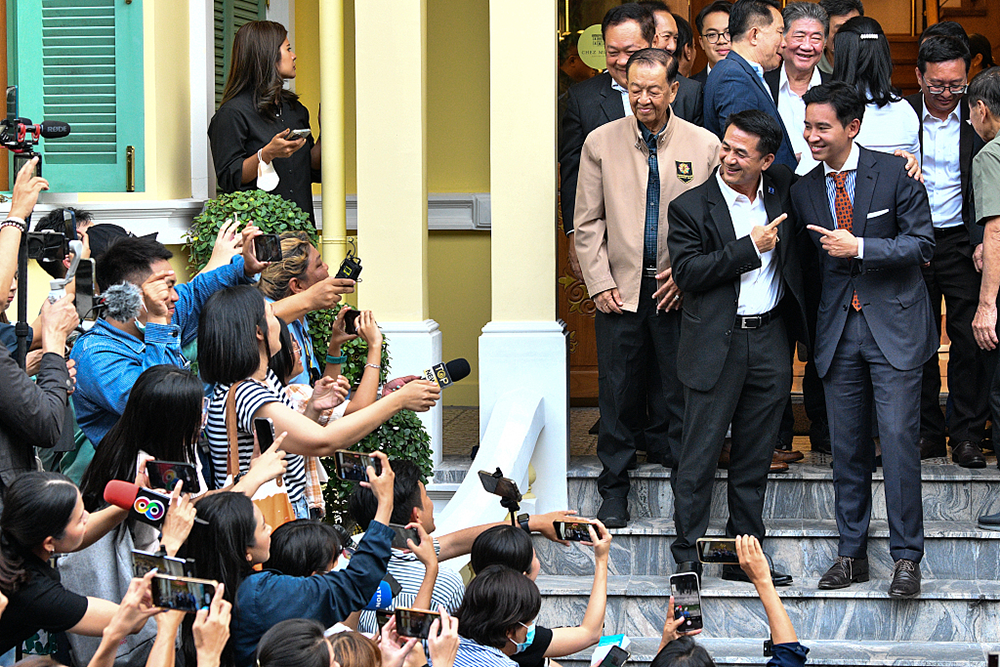 不得不说,远进党确实异于泰国政治发展史上所有政党,在大选当天票数统计刚刚过半时便宣布本党获得胜利,次日便宣布成功组阁,紧接着便是声势浩大的庆祝游行,组织执政联盟共进午餐,签订联盟成立的谅解备忘录,并且准备在5月22日这个特殊日子(即2014泰国军方发动政变夺权之日)正式宣布政府成立。这种快节奏的政治发展让人眼花缭乱,应接不暇,甚至一些不明就里的外媒认为泰国新政府已经成立,皮塔很快就要就任总理了。