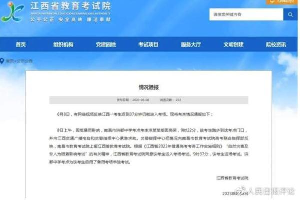 众所周知,为维护高考公平、防止考题泄露,考试须知明确规定,考试开始15分钟后,迟到考生不得进入考点参加当次科目考试。然而6月8日,有网友反映江西一考生迟到37分钟仍进入考场,引发网络热议。这究竟是怎么回事?