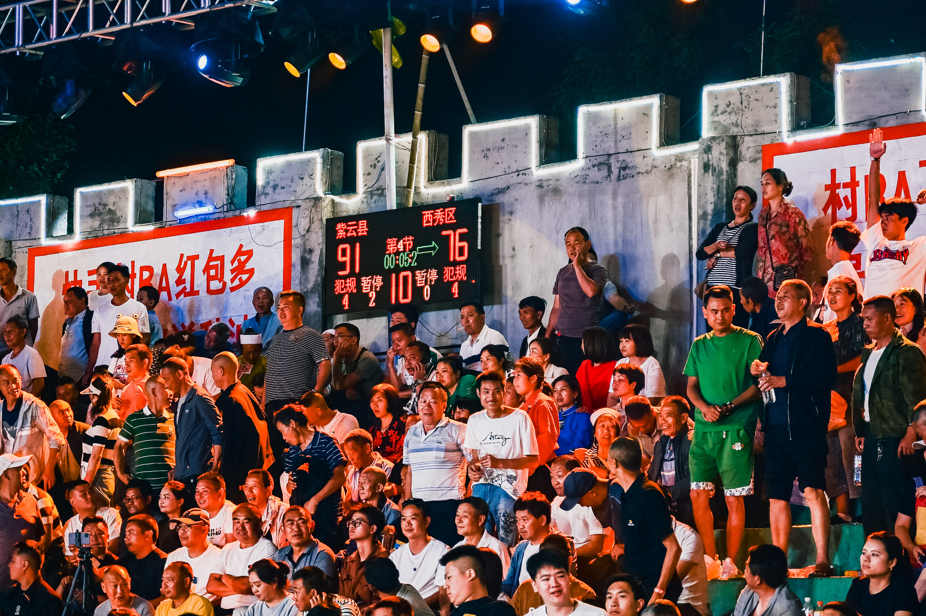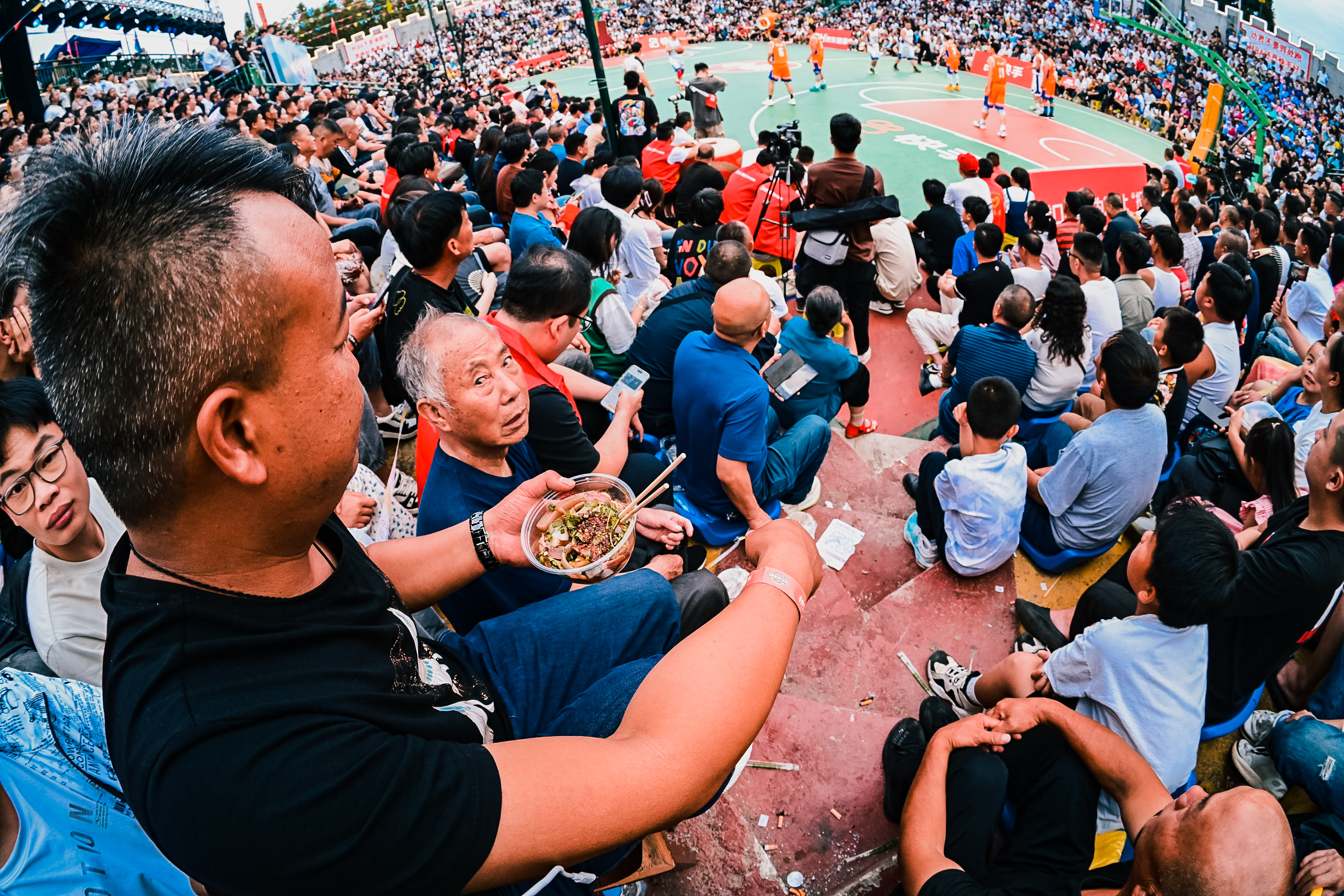 其次,“村BA”主打一个其乐融融,社区共享,围观群众无需购票,只要提前占座,便可以尽情观战,这与追求晋级和盈利的职业篮球赛形成了鲜明对比。决赛前日,小寨村篮球场边悬挂着各式横幅:“欢迎刘亦菲、迪丽热巴、杨幂……的仰慕者(反正你们也得不到)来村BA看球”、“劝君更尽一杯酒,严鹏不进球我不走”、“提前太久占座的村民记得带饭”,用土味幽默消解篮球比赛的精英气质;与这种松弛的氛围相反,参赛的县、乡、村代表队均以高昂的士气展开角逐,虽然大多是业余运动员——顶尖高手也不过来自大学校队,却展现出高超的技战术水平,令四里八乡赶来观战的球迷大赞过瘾,欢呼和喝彩(再加上腊肉和大鹅)就是对球员最好的报偿。“积极全球在地化”于此可以被阐释为以业余、松散、与民同乐的民间篮球精神对抗专业、严酷和市场导向的职业篮球体制的一次“反向冲塔”。