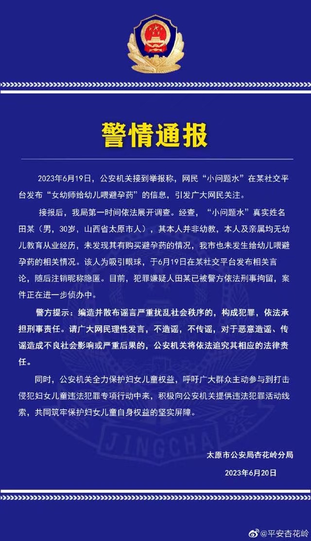 “女幼师利用职务之便给幼儿喂避孕药,搞化学阉割。”近日,这样一条惊悚新闻在互联网刷屏。很快警方发布通告,是一名男性网民炮制了这条谣言,目前已被警方刑事拘留。
