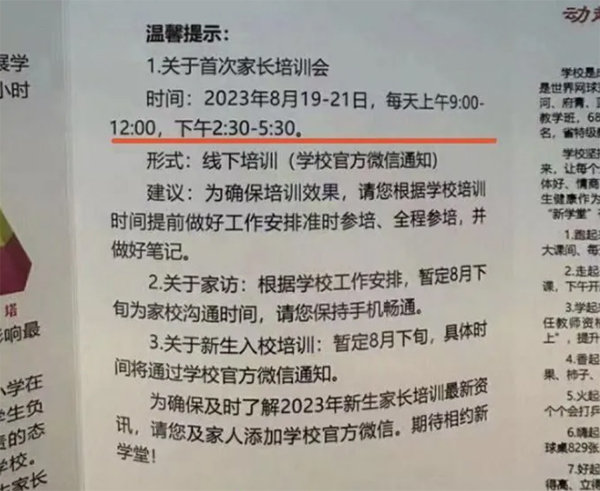网友发布的通知显示,2023年8月19日-21日举办首次家长培训会,每天上午9点-12点,下午2点30分-5点30分,形式为线下培训。此外,该学校还建议,为确保培训效果,请家长根据学校培训时间提前做好工作安排准时参培、全程参培,并做好笔记。真是一副煞有介事的样子,学生还没入学,家长先认真上课。