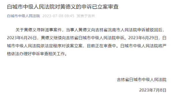 7月8日,白城市中级人民法院宣布已经依法定程序对该案的申诉立案,目前正在审查中。此外,洮南市委宣传部相关负责人也向记者表示:“这次事件中我们做了深刻的反思,认识到了工作中一些不足,目前正在积极改进。”