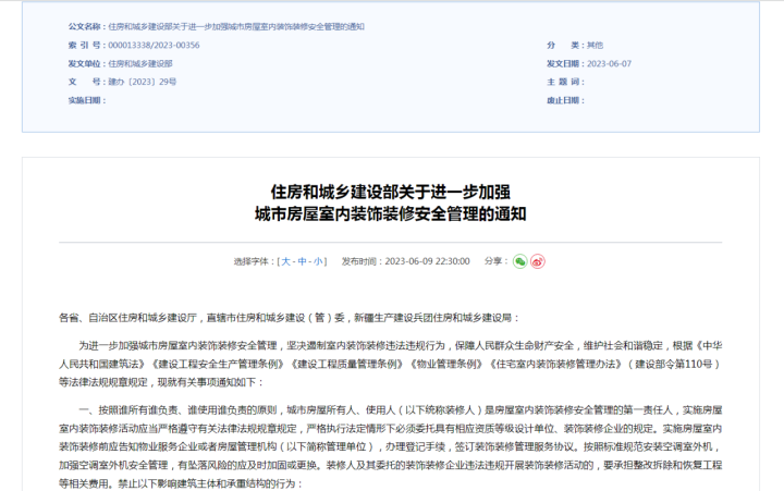 为了根治这一乱象,今年6月9日,住房和城乡建设部发布《关于进一步加强城市房屋室内装饰装修安全管理的通知》(以下简称《通知》)明确了装修活动中涉及的各方和各相关部门的责任,包括了设计单位、装饰装修企业、物业服务企业以及地方政府等。
