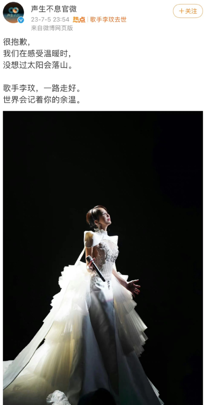 陪我们一路走来的,阳光、活力的李玟,会活在很多人的记忆里,她留给世界的背影,不会黯淡。因为三十年如一日的职业素养和敬业精神不会黯淡,因为对世界的爱和善意,不会黯淡。唯希望在另一个世界,这份爱和善意不只是向外,也能向内关照自己,给自己带来光亮。