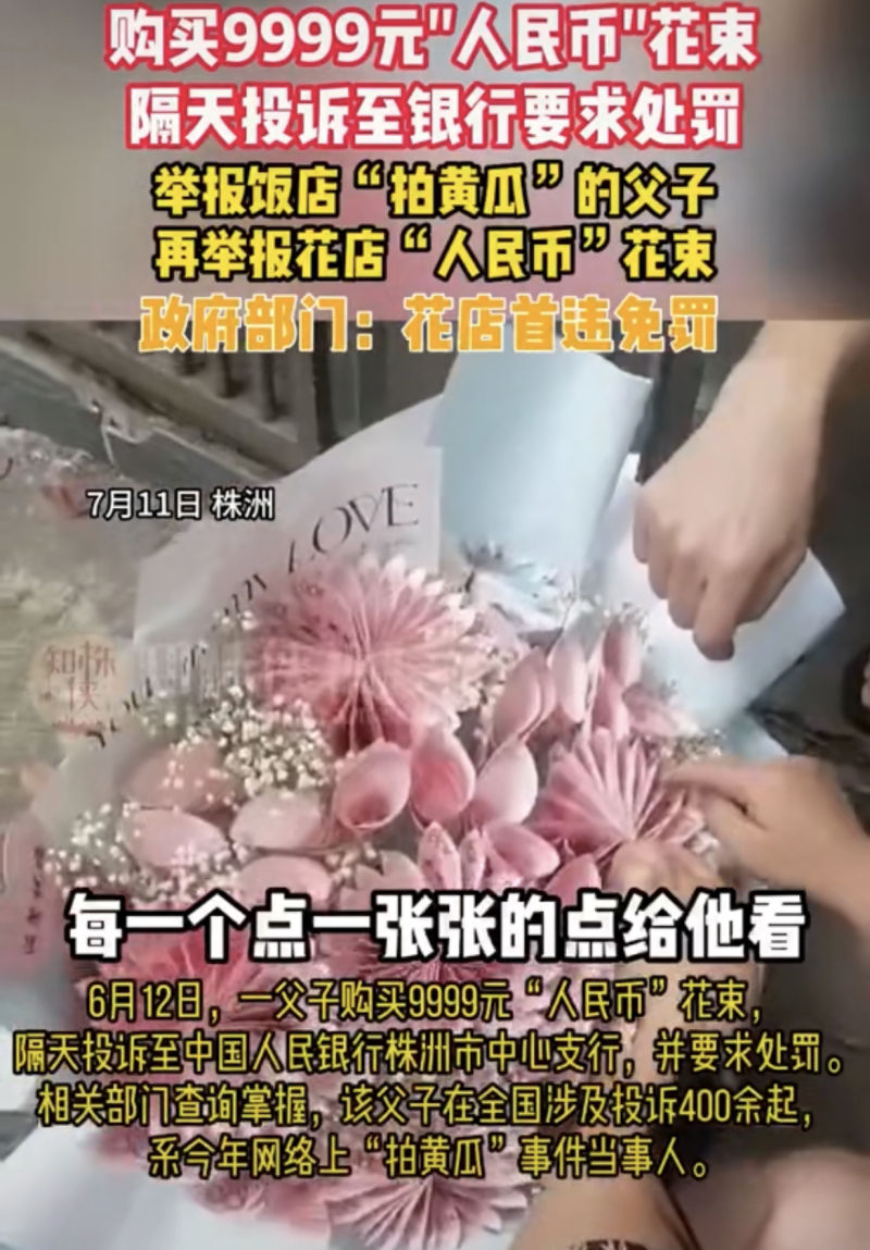 ▲7月11日,一对父子在湖南株洲一家花店购买9999元“人民币花束”,隔天投诉至中国人民银行株洲市中心支行,要求处罚。截图来自社交媒体