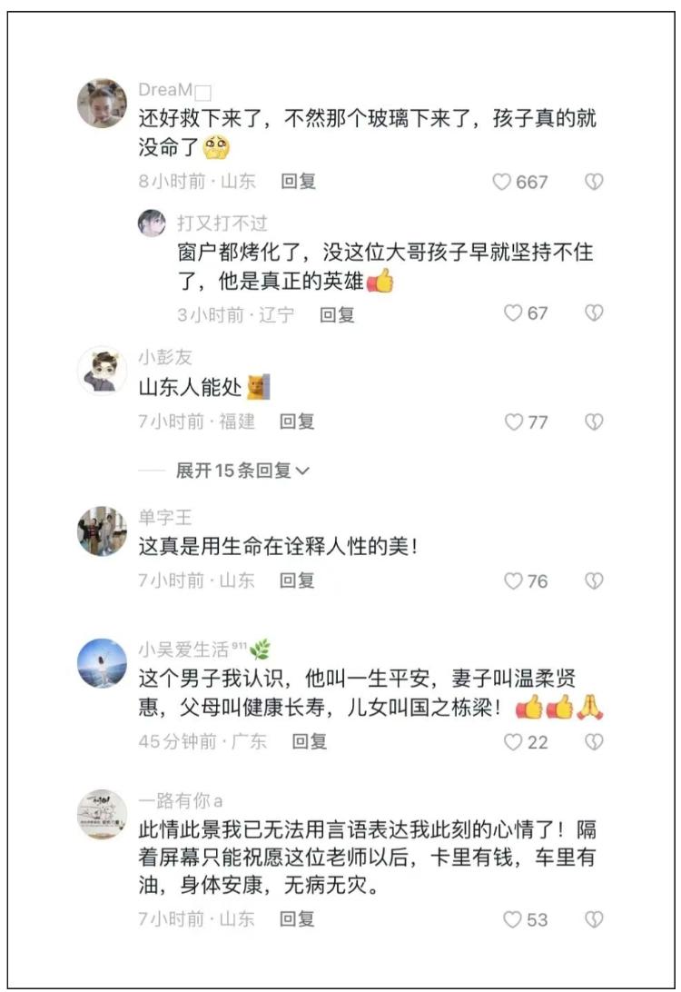 从一条条留言里,能够看到人们对英雄的真心赞扬。尽管网络上的信息鱼龙混杂,情绪复杂多变,但人们对真善美的追求和对英雄的崇拜,从来没有变过。从杭州的跳河救人,到这次的徒手爬窗救人,正是一次次善举,让人们一次次确认人性中向上向善的力量,并不断去向榜样学习、效仿。