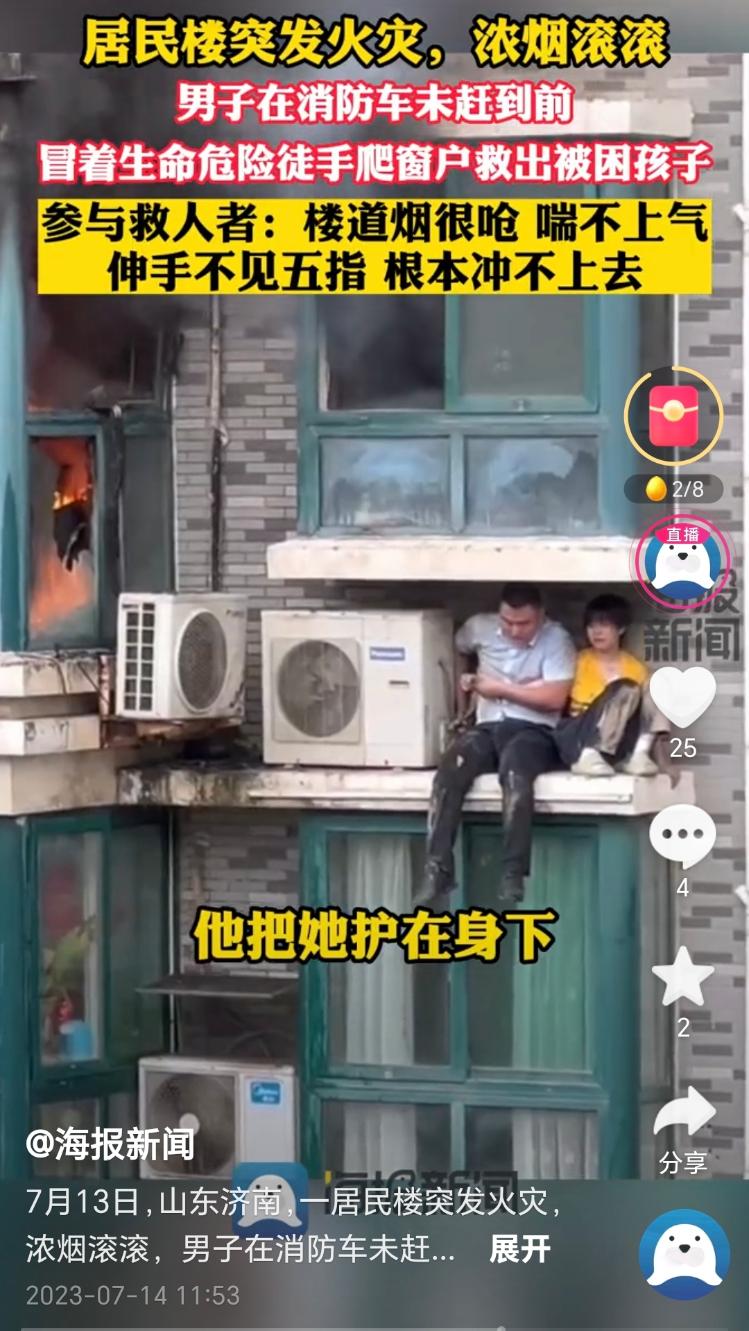 孩子被火势逼着骑坐在窗户上,屋内已经是熊熊大火,一名男子徒手爬上窗台,一点点将孩子转移到下面的空调外机平台上,拉着孩子一起等待消防救援。就在等待的过程中,上面的窗户被烧得掉了下去……7月13日,济南一处小区内发生的火情令人揪心,危急之下邻居的救人举动更是感动全网,大家都呼吁这样的英雄必须得到全社会的大力褒扬。