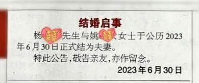 记者联系到了将于今年九月份结婚的张女士,张女士说,自从看到关于结婚登报的热搜,自己就和丈夫商量决定结婚那天也要登报。“感觉结婚登报很有仪式感,要是能用红色边框字体就更好了”,张女士说,她打算把刊登有自己结婚公告的报纸装裱在相框里,像有的新人装裱结婚证一样。