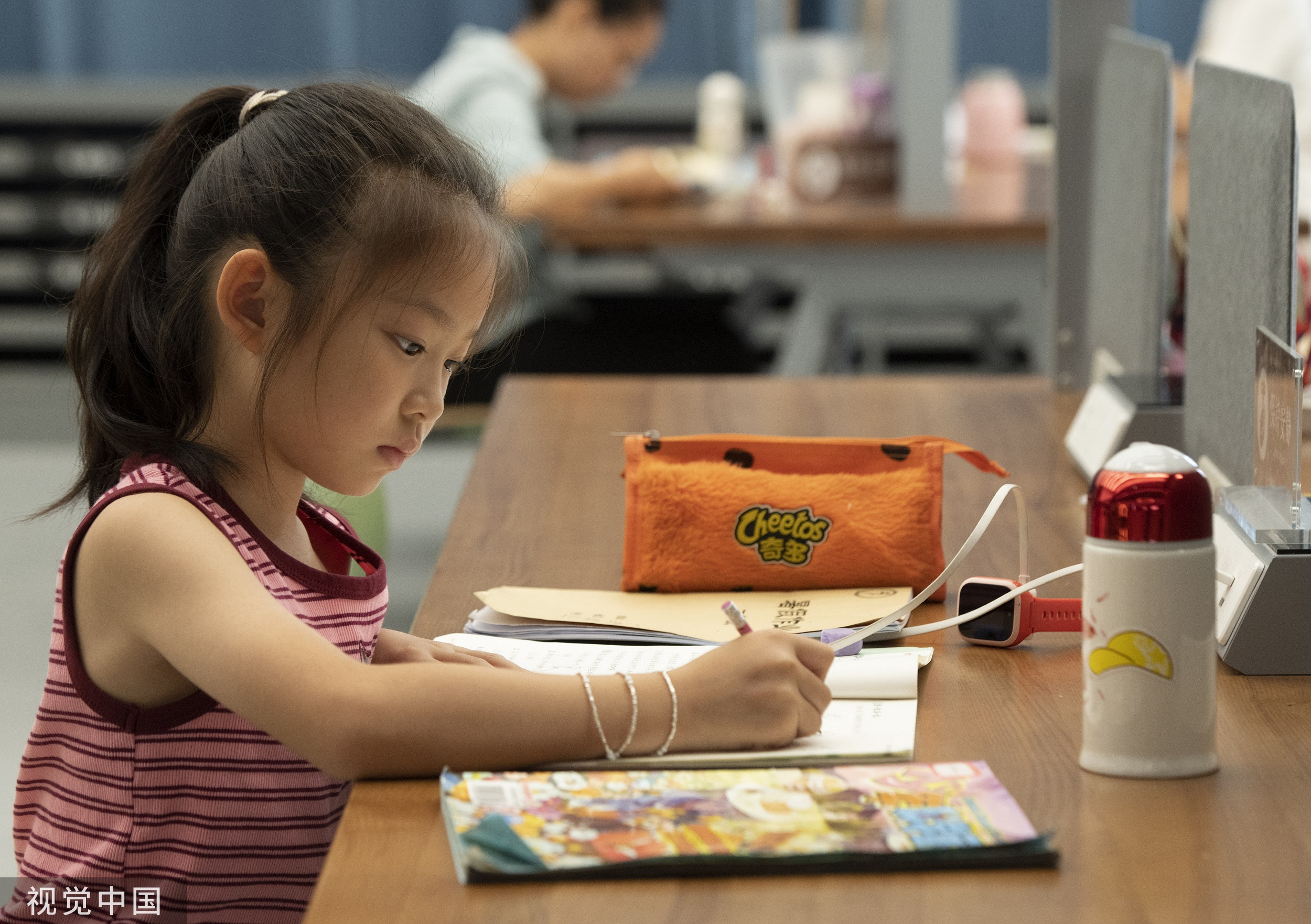 2023年7月12日,浙江金华,在金东区图书馆里,小学生在做暑假作业。视觉中国图
