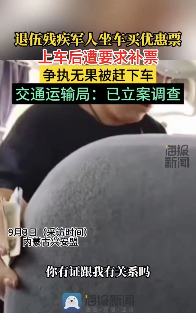 ▲近日,内蒙古兴安盟一位残疾退役军人坐车买优惠票,上车后被要求补票。图/海报新闻视频