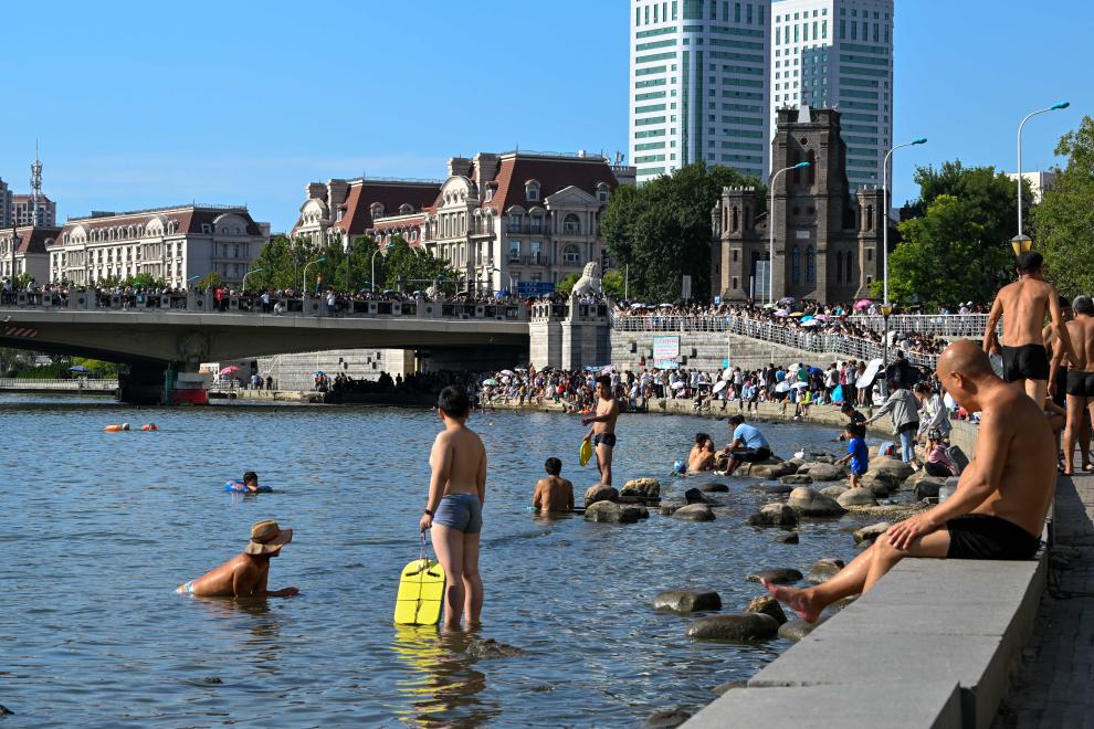 8月29日,天津海河狮子林桥附近,许多人在跳水和游泳,还有许多人在岸上围观。新华社记者孙凡越摄