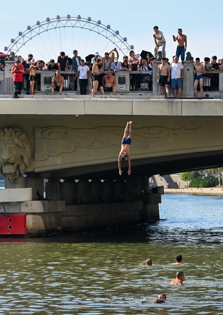 8月29日,天津海河上,一位“大爷”从狮子林桥跳入水中。新华社记者孙凡越摄