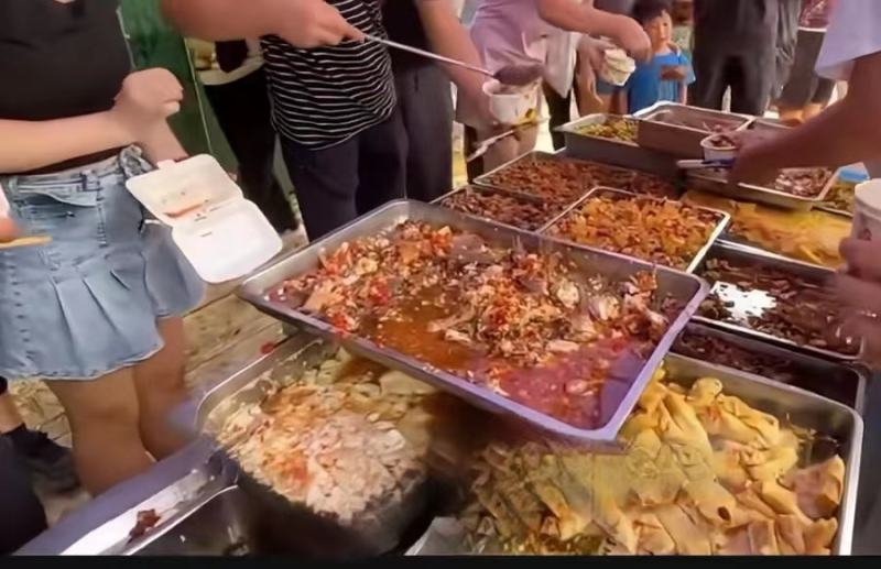▲“十元盒饭姐”摊位挤满了取餐的人。图/社交媒体平台视频截图。