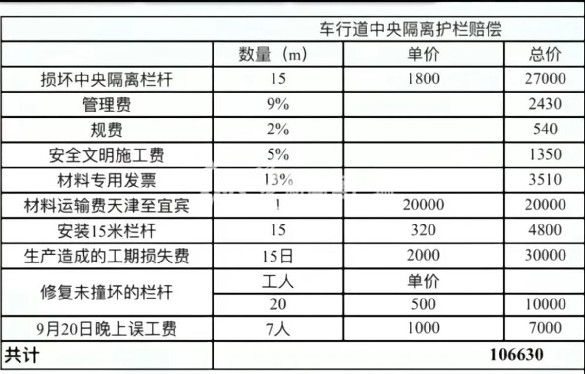 根据这名发帖网友所附的赔偿明细表显示,损坏中央隔离栏杆价格为每米1800元,15米总价27000元,还包括材料运输费20000元、工期损失费30000元及20名工人的施工费10000元等各10项费用,共计106630元。