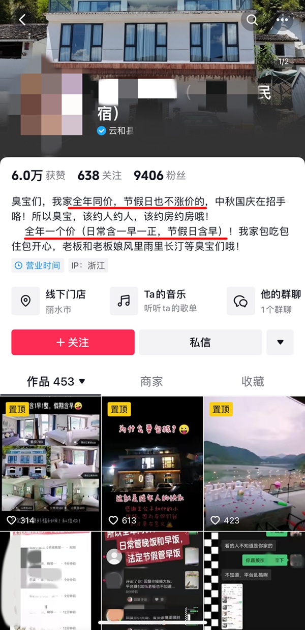 另一短视频平台上,丽水这家民宿老板在简介中强调,自家民宿“全年同价,节假日也不涨价”
